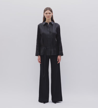 RAMSA OVERSHIRTOvershirt made with strips of nappa leather sewn onto a tulle base. Snap-button closure concealed by a placket. Long sleeves with buttoned cuffs.