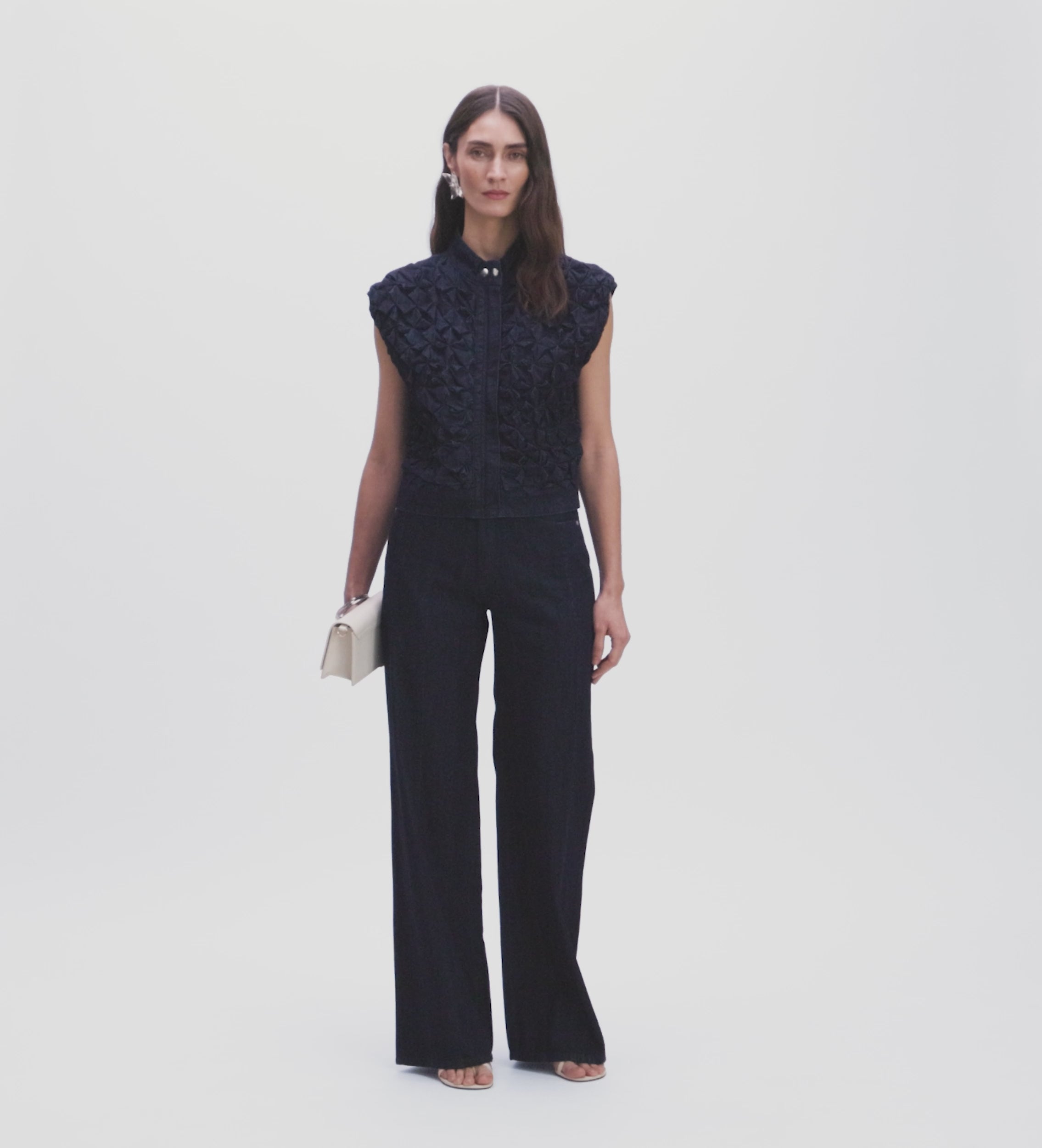 Five-pocket, wide-leg trousers made from a lightweight denim-type fabric. Waistband with belt loops. Concealed zip fly and button fastening. Double vertical topstitching detailing on the front.