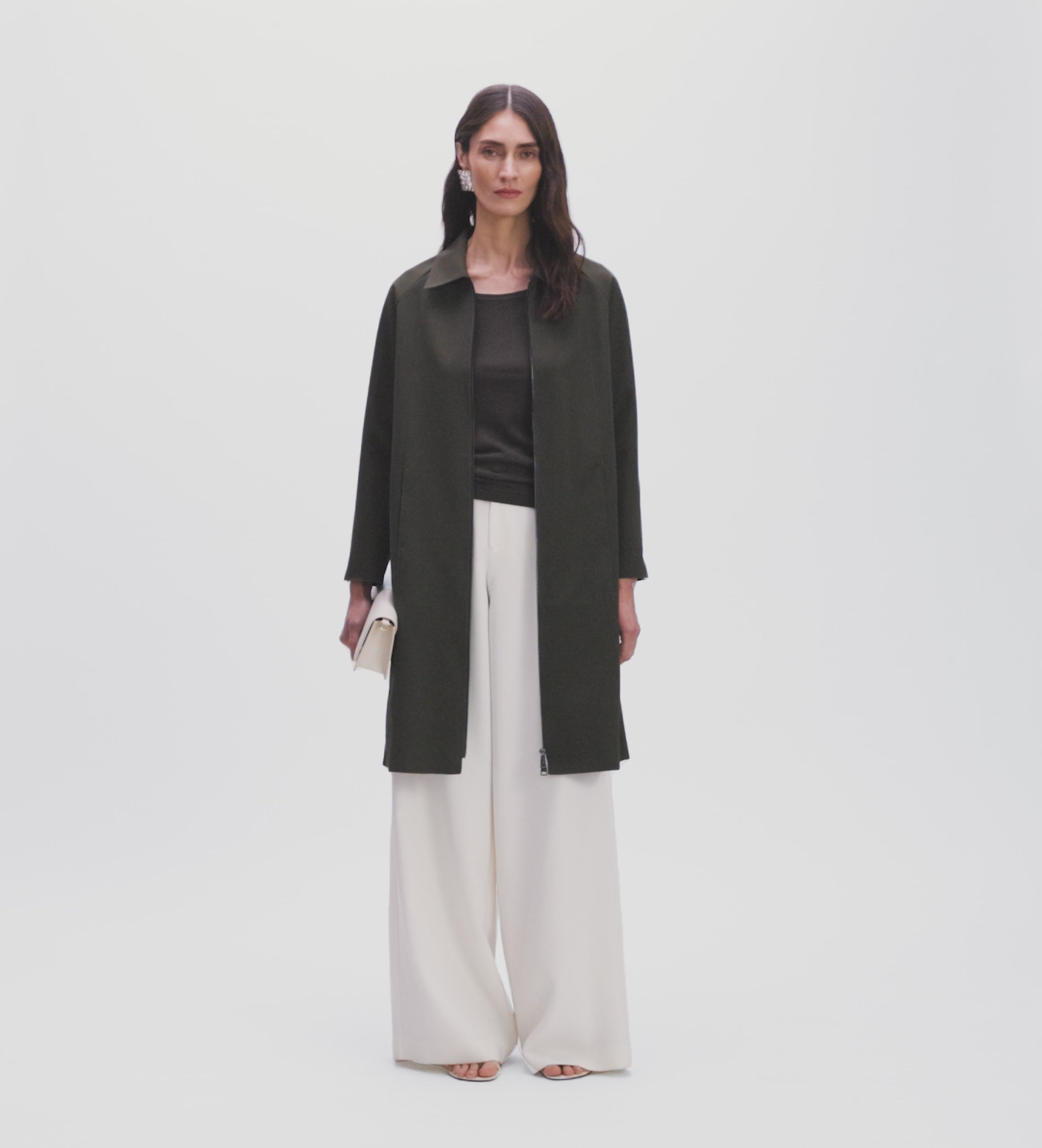 Neoprene trench coat with raw-edge trim. Shirt collar without a stand-up collar and raglan sleeves with a zip detail at the top extending to the shoulder. Concealed side seam pockets. Double-slider front zip closure. Back vent at the hem.