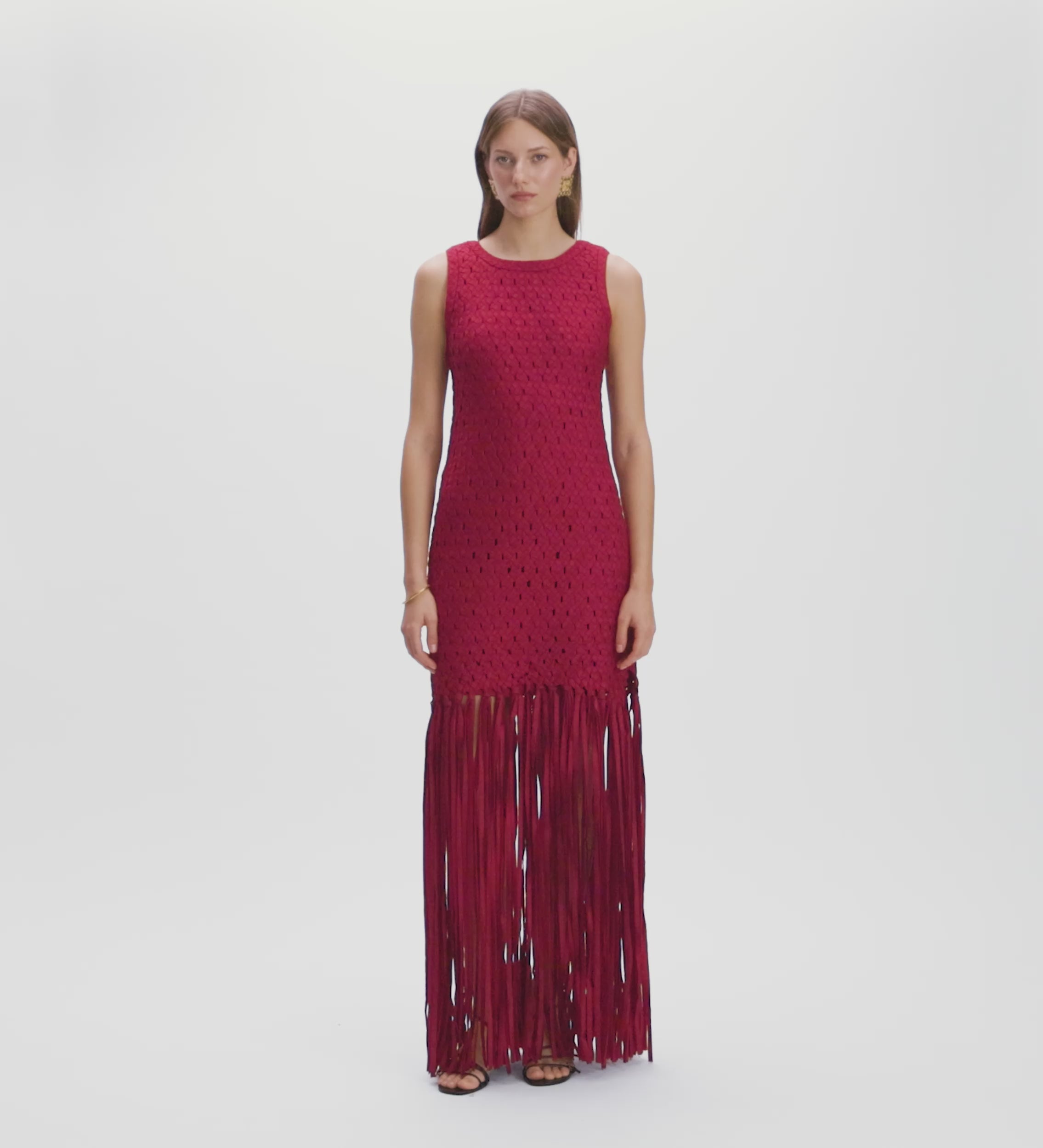 Long, sleeveless, straight-cut dress made from hand-woven taffeta fabric. Crew neckline. Fringe trim in the same fabric at the hem. Invisible zip fastening at the back. Matching lining included.