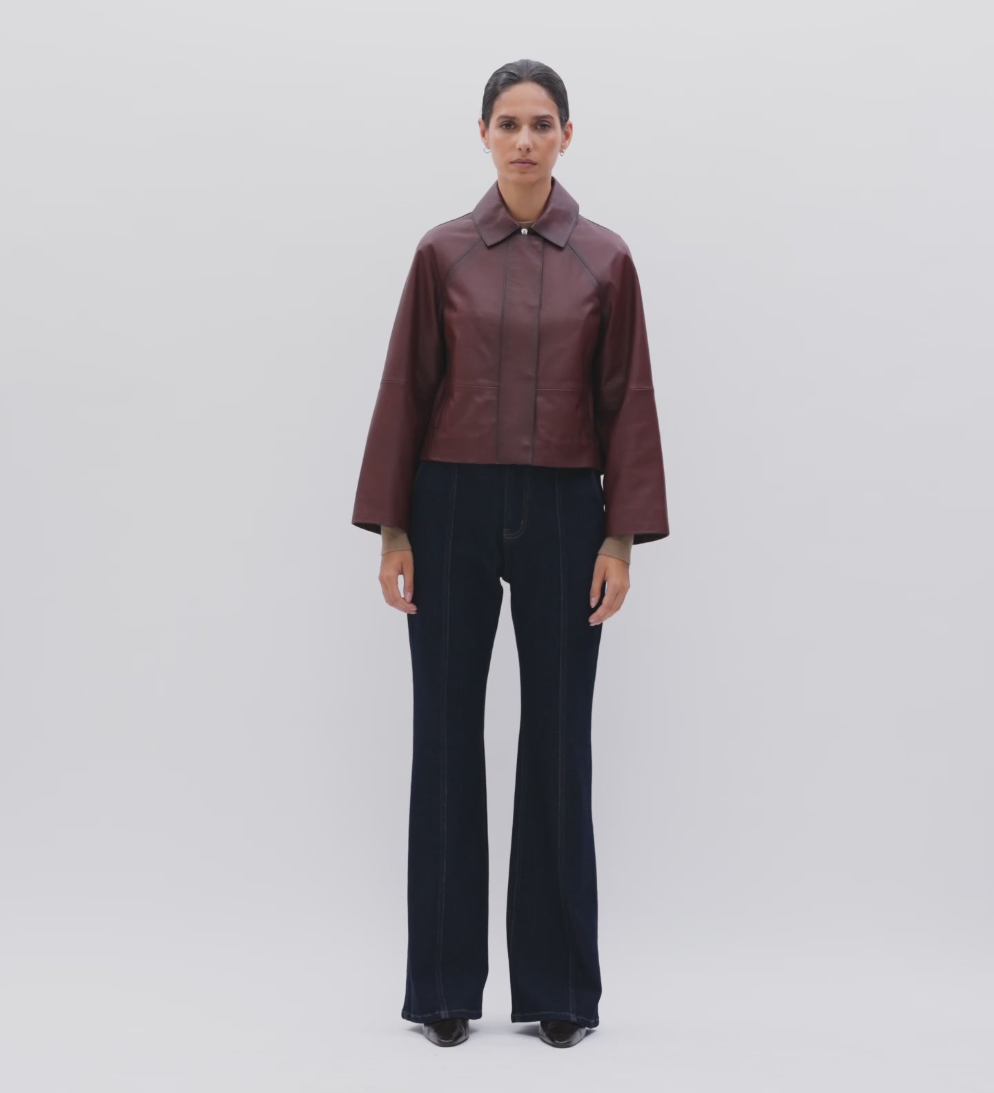 Cazadora de napa con cuello gabardina. Cierre mediante cremallera oculta por tapeta y botones a presión. Manga ranglan. Bolsillos de vivo. Forro interior.