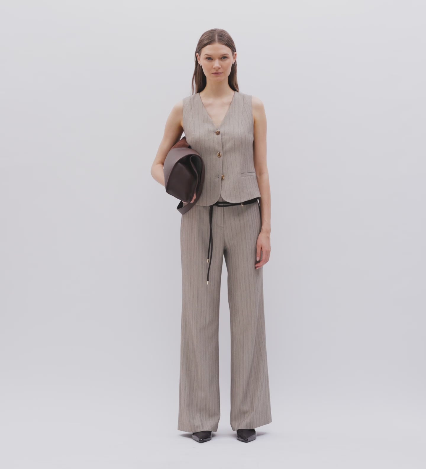 Pantalón de pierna ancha con diseño de espiga y estampado de rayas. Cinturilla con corchete y cremallera ocultos. Bolsillos de vivo en la parte posterior.