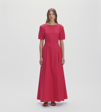 Vestido largo de vuelo con juego de pinzas y costadillos en los laterales. Manga abullonada, escote barco en el delantero y espalda escotada en forma de cuadrado en espalda. Cierre mediante cremallera invisible en espalda.