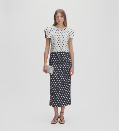 Top de silueta cuadrada confeccionado en tejido de satén con estampado de topos reversible. Escote caja y mangas de diseño con aberturas. Cierre mediante botones en espalda y trabillas.