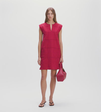 Vestido mini de silueta recta confeccionado en piezas de lino unidas con cintas de entredós. Escote caja con abertura de lágrima en el delantero y hombro alargado. Bolsillos laterales. Cierre mediante cremallera invisible lateral.