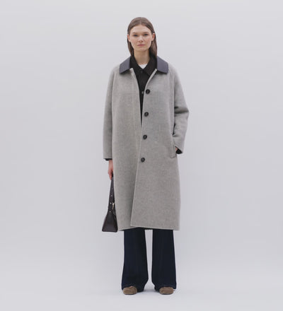 Manteau en cuir nappa à col en gabardine. Manches raglan. Fermeture boutonnée centrale dissimulée avec rabat. Poches latérales passepoilées.