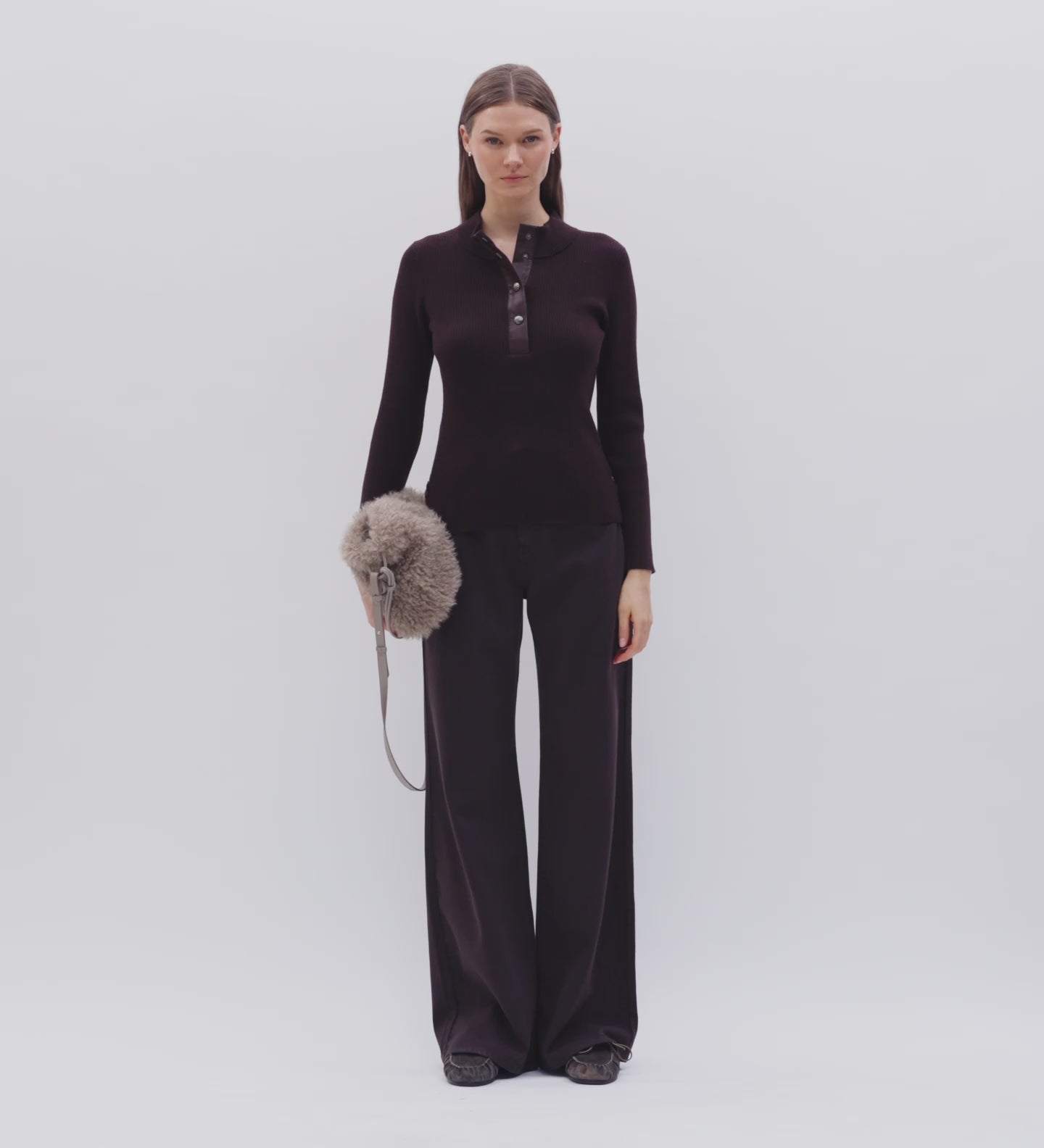 Pull côtelé fin à col ras du cou et col polo avec patte de boutonnage en similicuir et boutons-pression. Fentes latérales bordées de cuir et boutons-pression. Ourlets aux finitions impeccables.