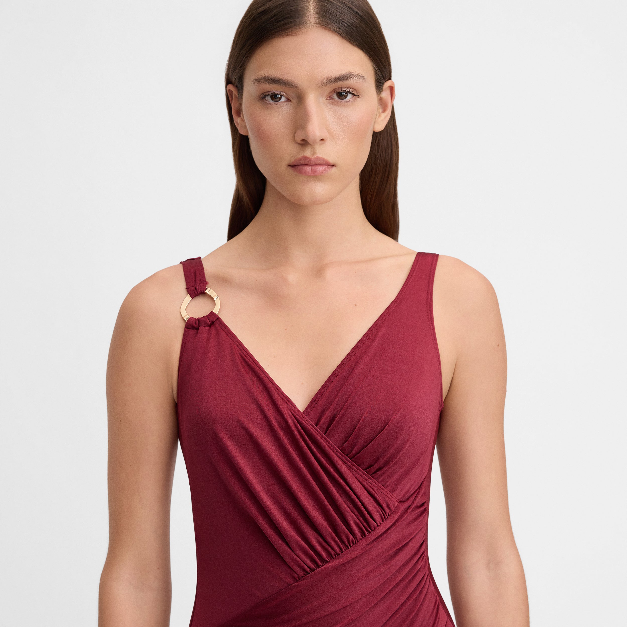 BAÑADOR LOPPYBañador de una pieza con diseño cruzado en el torso. Escote en "V" con pliegues drapeados. Detalle de joya dorada en el hombro. Tirantes asimétricos. Espalda en U. Foams extraíbles.
