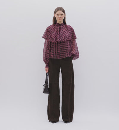 Blusa estampada con cuello capa. Manga abullonada acabada en puños con nido de abeja. Cierre mediante botones ocultos por tapeta. Presillas de corchete en hombro para unir camiseta de tirantes interior a tono.