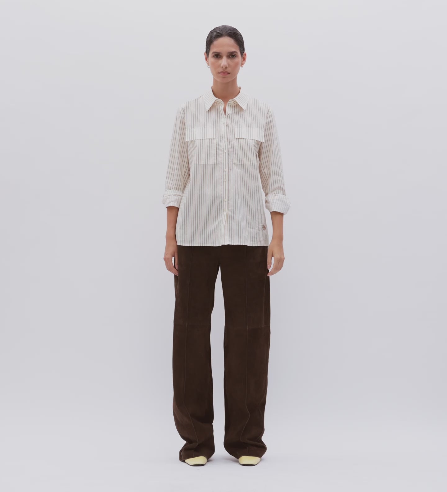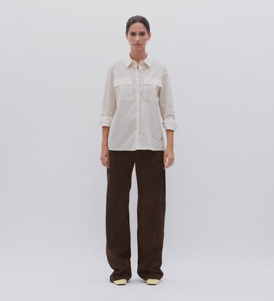 Camisa de rayas. Manga larga. Bolsillos de parche en el delantero. Cierre mediante botonadura frontal.
