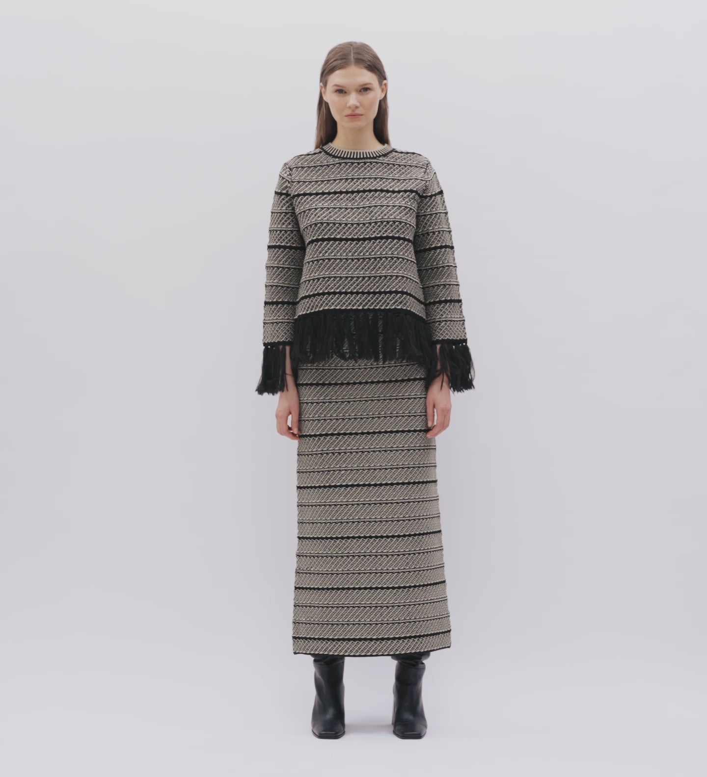 Falda midi de línea evasé realizada en un punto de fantasía. Goma oculta en cinturilla con canalé.