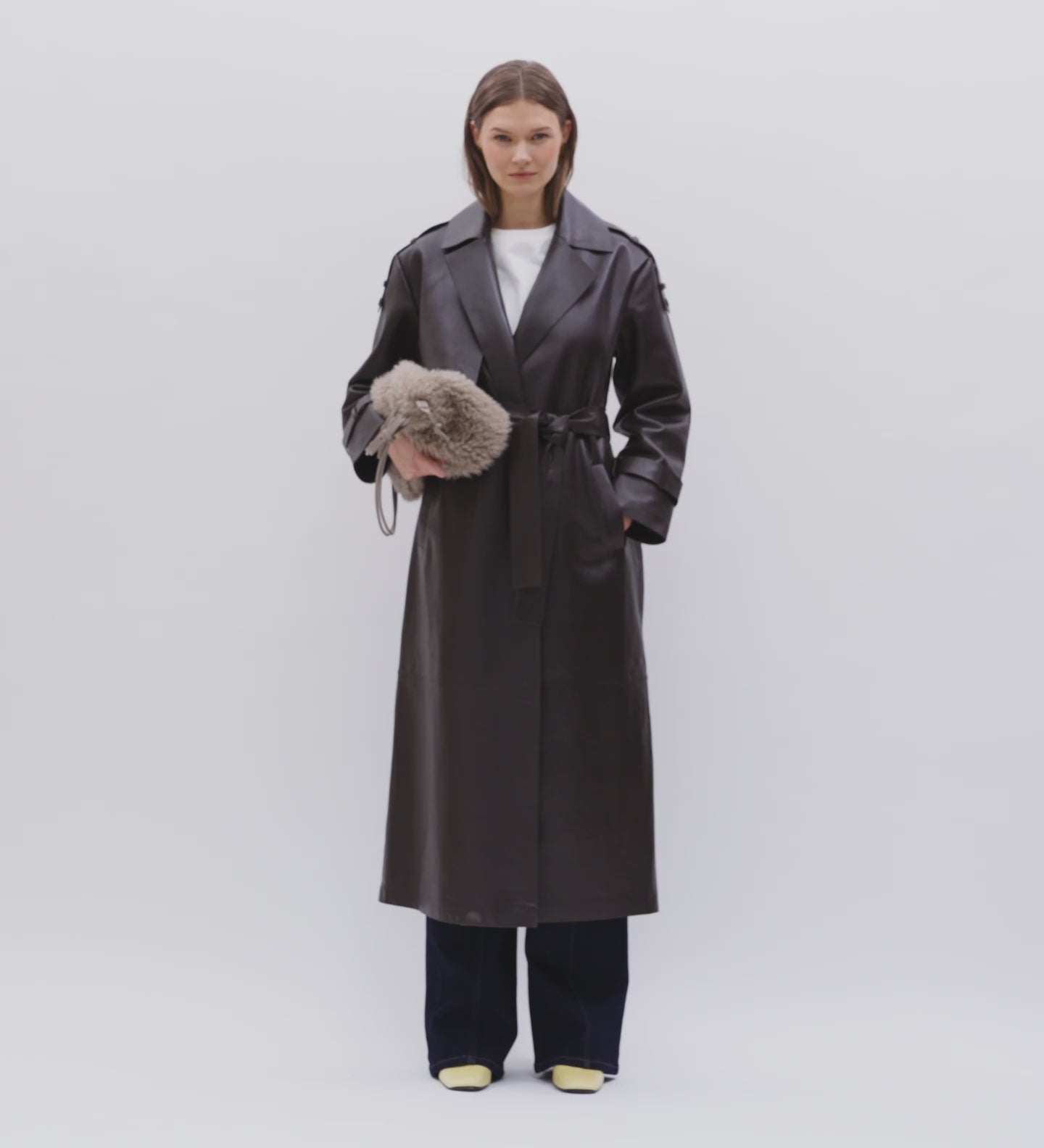 Gabardina de napa larga con cantos lujados. Bolsillos laterales inclinados. Cierre mediante cinturón de napa.